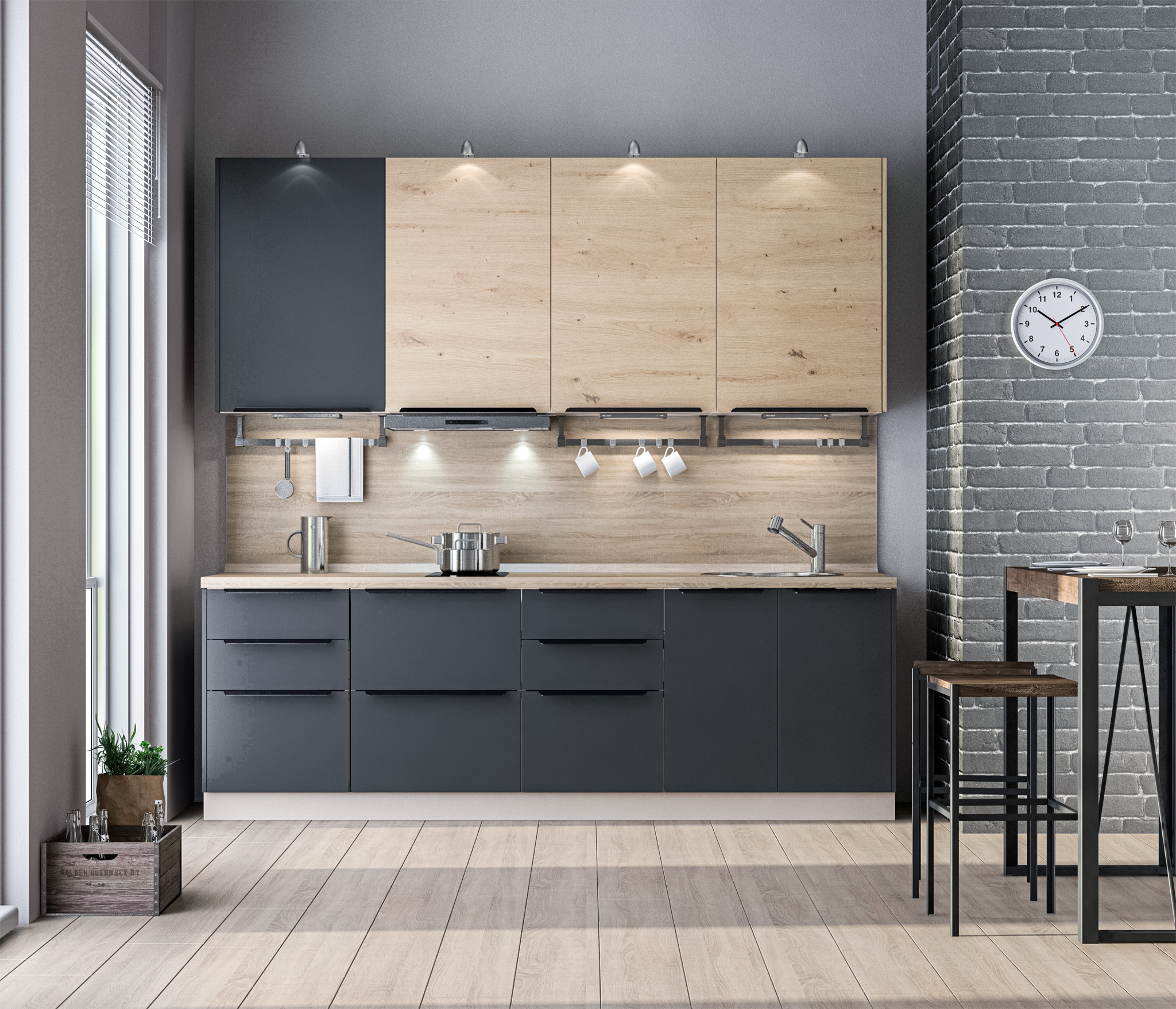 В расчет стоимости кухонного гарнитура входят: напольные шкафы и навесные полки с фасадами, фурнитура, ножки, петли, направляющие.