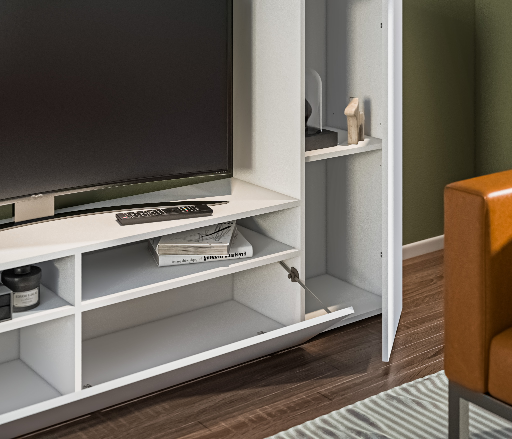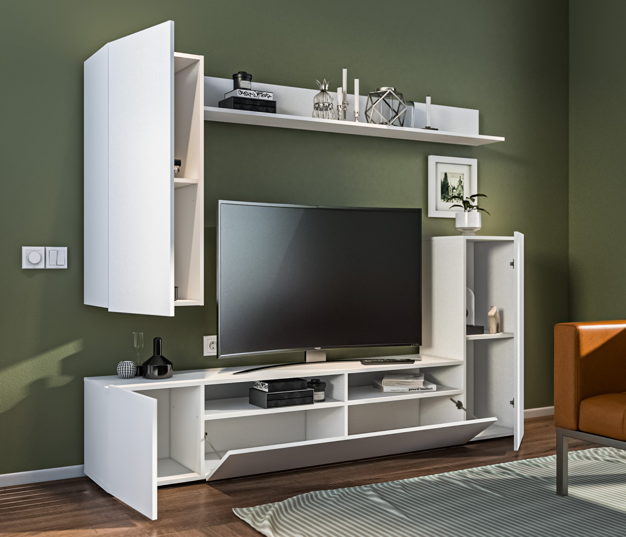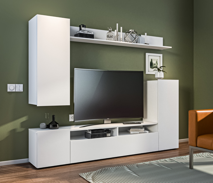 В состав стенки входит: тумба под телевизор с открытыми полками для видео, аудио аппаратуры и отделениями с непрозрачными дверцами, открытая полка для демонстрации коллекции декоративной посуды или памятных сувениров, закрытые модули для книг, посуды.